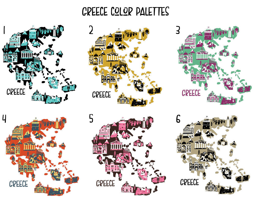 Greece print in six color options. Color palette choices are pink/brown, turquoise/black, black/mustard, purple/green, gray/yel/rust, or black/taupe, or if you want two different colors, order the personalized version and leave a note with the PMS color numbers or email me the two colors you’re wanting. I’ll do my best to get as close as I can.