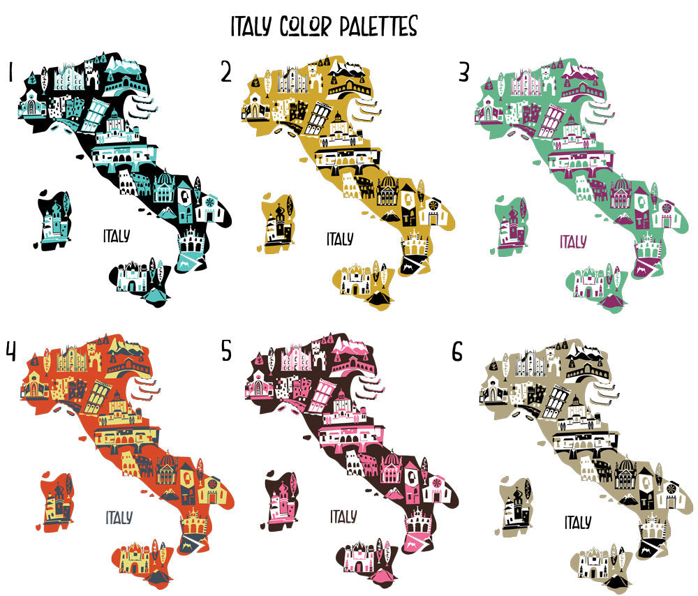 Italy print in six color options. Color palette choices are pink/brown, turquoise/black, black/mustard, purple/green, gray/yel/rust, or black/taupe, or if you want two different colors, order the personalized version and leave a note with the PMS color numbers or email me the two colors you’re wanting. I’ll do my best to get as close as I can.