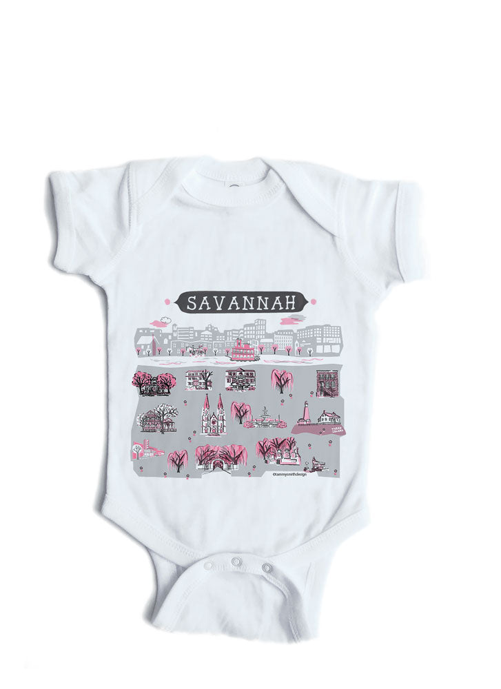Infant onesie bodysuit with our original illustration of the city of Savannah GA on it. If you'd like a name or saying added under the design, just choose that option and leave me a note when ordering.