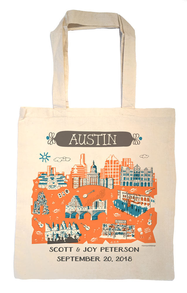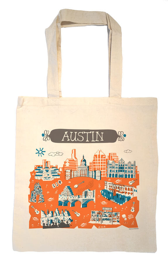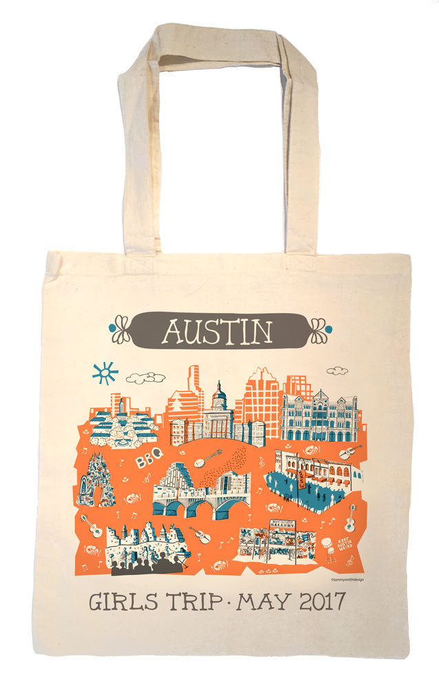 The Austin tote bag is perfect for carrying your groceries home from the farmer’s market! Made of 100% cotton with self-fabric handles. Makes a great shower, wedding welcome tote or housewarming gift and it can be personalized! Also be sure to check out the other Austin items including tea towels, mugs, platters, trays, prints, and pillows.